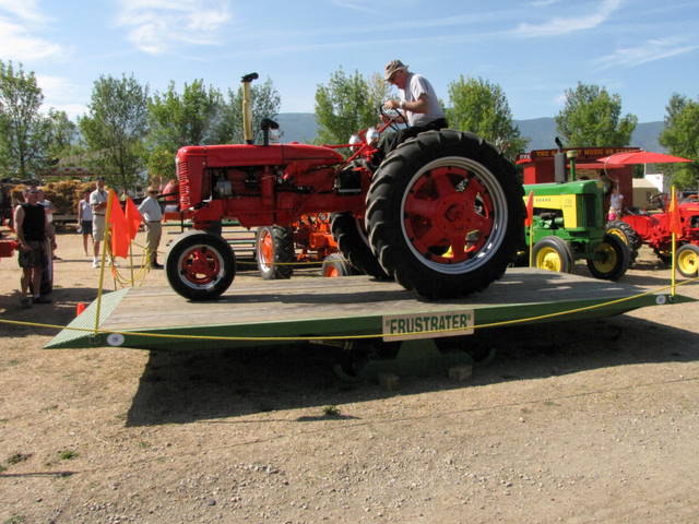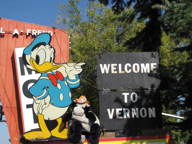Wij rijden door naar Salmon Arm. Hier is de jaarlijkse fair aan de gang en die is best groot. Verdeeld over twee terreinen zijn allerlei agrarische activiteiten te zien. Er zijn stallen met geiten, paarden en ja ook zwart witte koeien. Eindelijk lukt het Koen in Canada met soortgenoten op de foto te gaan. In twee hallen zijn de uitslagen van allerlei competities te vinden. Denk dan aan: de meest bijzondere groente, de mooiste bloemen kruiwagen, de zwaarste pompoen (318,5 lbs oftewel 144 kilo), enz, enz. Er zijn meer dan honderd verschillende competities. Tijdens het eten van een zakje Nachos met een heerlijke vulling kijken we ook nog even naar de talentenjacht met allerlei pluimage. Op het andere terrein zijn behendigheidswedstrijden met mennen te zien, allerlei antieke agrarische machines en een kleine kermis. Het benoemen waard is de “frustrater”. Op deze evenwichtsbalk proberen een aantal (even oude als fanatieke) boeren om hun antieke trekkers in evenwicht te brengen, erg leuk om te zien.