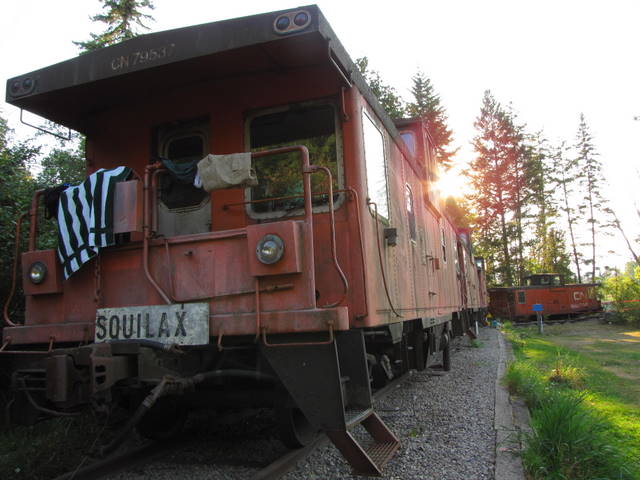 September is de appelpluk maand dus er is van alles te beleven. Ook liggen er enorm grote pompoenen op een nieuwe eigenaar te wachten. Van het gezonde fruit verplaatsen we ons naar de McDonalds voor de Canadese hamburger test. Met anderhalve dollar is de burger niet goedkoop, maar het stuk Canadese beef smaakt prima en het broodje is gemiddeld droog. De paar uitjes en saus kunnen dat slechts gedeeltelijk compenseren dus we zijn gematigd positief. We checken ook gelijk even de mail met het gratis internet en proberen een Amerikaans treinkaartje te kopen. Hiervoor moeten we nog een keer bellen met de Amtrak en dus zoeken we nog een telefooncel op. Het nummer is gratis en dat is maar goed ook. Rhianne moet eerst tien minuten in de wacht voor ze contact krijgt met waarschijnlijk het grootste wappie van de Amtrak. Maar liefst drie kwartier en minimaal zes keer in de wacht duurt het voordat de treinkaartjes en reispassen zijn besteld. PFFF. We rijden verder noordwaarts richting Salmon Arm. Aan het eind van dit dorp pikken we een lifter op. Hij is sinds vanmorgen op weg vanaf Calgary en is op weg naar Chilliwack en heeft dus nog een stuk te gaan. Wij kunnen hem slechts een klein stukje verder rijden, maar alle beetjes helpen. Als we hem eruit laten blijken we ongezien net voorbij ons hostel, wat slecht aangegeven staat, gereden te zijn. Een zoektocht van bijna een uur volgt waarbij we minimaal drie keer de weg vragen. Uiteindelijk loont het vele zoeken wel want vanavond slapen we in een voormalige caboose. Dit is een conducteurswagon die in Canada veel gebruikt werd bij het goederenvervoer. Er staan vier van deze treinstellen opgesteld aan een mooi meer tussen de bergen. Het eten op het elektrische pitje wil niet echt vlotten en als Rhianne de opgewarmde worstjes uit de oven pakt brand ze twee vingers. Au! We hebben wel mazzel, aangezien er niemand bij komt hebben we de coupé voor ons alleen. Als we gaan slapen horen we het geluid van een echte trein op de achtergrond. Totale afstand vandaag: 205 km.