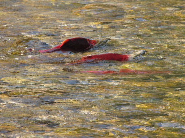 Jammer genoeg zijn ze een beetje dik, niet in een keer gaar en verstieren de tientallen wespen een rustig momentje genieten. Na het eten van drie BigMac pannenkoeken met Maple Syroop en boter vinden we het genoeg en gaan onze tassen inpakken. We rijden een klein stukje noordelijker naar Scotch Creek, hier is de jaarlijkse zalm voorplanting als eerste begonnen. Dit is een heel bijzonder natuurfenomeen. Nieuwe zalmen blijven doorgaans één jaar in de rivier voor ze naar de oceaan gaan om zich vol te eten. Vissen die niet gevangen worden door een orka, beer of vissersboot keren na één tot vier jaar terug naar de rivier. De vrouwtjes die dan zwanger zijn worden bloedrood. Na het leggen van eitjes, tussen de stenen van de rivier waar ze geboren zijn, gaan ze dood. Hierdoor vormen ze weer voedsel voor vogels. De mannetjes bewaken de eitjes. Wij zien slechts enkele tientallen rode zalmen, zowel levend als dood en een aantal nesten met eitjes. In oktober wanneer de grote trek begint wordt gesproken over rode rivieren.