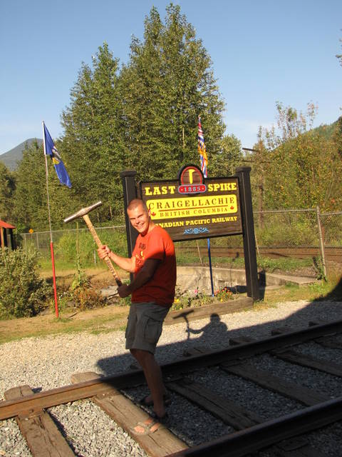 Dan is het hoogtijd om de auto op te zoeken en de Trans Canadian Highway te gaan volgen richting Revelstoke. Al snel pikken we Canadian Pacific Railway op en deze lijn gaan we grotendeels volgen op zijn weg door de Rocky Mountains. We stoppen onderweg even bij de Last Spike. Op deze plaats werd op 7 november 1885 de laatste spijker geslagen van de spoorweg. Als we zelf ook nog een symbolische spijker geslagen hebben gaan we op weg naar Revelstoke waar we onze volgende couch hebben. Het huis van Chad staat aan de rand van de stad en heeft uitzicht op de dichtbij gelegen bergen waarvan eentje zelfs sneeuw op de top heeft liggen. De blauwe rivier aan de voet van de berg maakt het mooie plaatje compleet. Aangezien Chad niet aanwezig blijkt te zijn wandelen we eerst even naar het park om te genieten van het zonnetje en het uitzicht op de drie bruggen. We pikken de WIFI op van een dichtbij gelegen motel en zorgen dat de Dropbox weer een stel foto’s kan back-uppen. De tweede keer hebben we meer geluk en vinden we Chad thuis, samen met zijn huisgenoot en een andere couchsurfer Mark. Na een diner bestaande uit soep met brood en de overgebleven helft van de broccoli van gisteren, drinken we een biertje met Chad en Rhianne gaat aan de Palm Bay, een grapefruitdrankje met wodka. Totale afstand vandaag: 190 km.