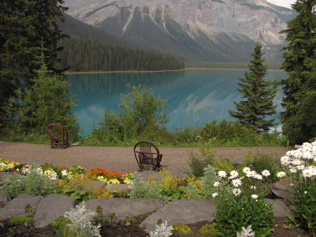 Via een steile shortcut gaan we naar de rivierbedding. Hier ligt heel veel leisteen en Rhianne vind een paar mooie conglomeraatsteentjes. Op de terugweg schieten nog een paar eekhoorntjes voor onze voeten langs, daar hebben ze er veel van in dit deel van Canada. De autoroute voert verder door mooie valleien en we zien verschillende gletsjers. We volgen een stukje van de spoorlijn en één keer krijgen we de mogelijkheid wat mooie plaatjes te schieten vanaf een brug. Ongeveer tien kilometer van de weg af ligt onze volgende bestemming het Emrald Lake. Zo mooi blauw water hebben wij eigenlijk nog nooit gezien en de foto die we schieten is echt een reisgidsplaatje.