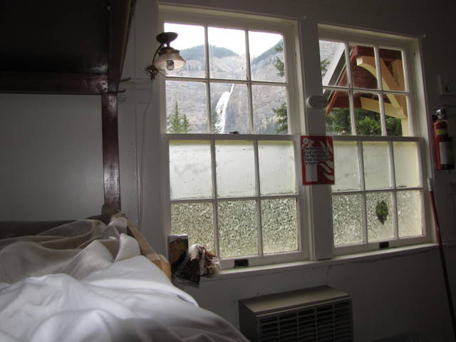 We wandelen een halfuurtje langs het meer en eten op een paar rotsen onze late lunch. Aangezien het al tegen vieren loopt als we terug zijn bij de auto, beslissen we om in het bezoekerscentrum een dagpas te halen voor morgen en dan naar onze volgende slaapplek te gaan. Dit is het Whiskey Jack wildhostel bij de Takakkaw waterval. Deze waterval is echt magnifiek en dat betekend het dus ook in Cree Indian. Een heel smal maar vol stroompje komt uit de berg, valt meters naar beneden, klapt op de rotsen en spat in een brede stroom uiteen die nog ruim 250 meter naar beneden valt. Het is de 2e hoogste waterval in Canada. We checken in, krijgen een rondleiding en kiezen bedden met uitzicht op de waterval. Het hostel is volledig van hout, er is geen elektriciteit maar wel stromend water en gas. Dit laatste wordt gebruikt voor de verlichting, verwarming en de koelkast. Niet verwonderlijk dat het her een der een beetje naar gas ruikt.