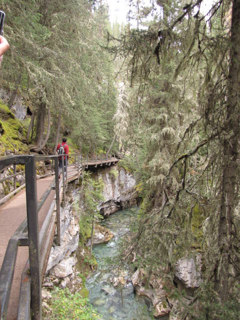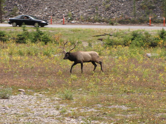 18 september. Er staat een tripje naar het zestig kilometer verderop gelegen Banff op het programma. We kiezen voor de meer toeristische weg 1A over de Bowvalley Parkway. Langs deze weg zijn wat meer interessante stopplaatsen dan de langs de highway. Ook is er een grotere kans om wildlife te zien. Net als we het hebben over het weinige wildlife wat we gezien hebben, staat er ineens in een bocht en dertig meter voor de auto een eland (elk) op de weg. Dit uit de kluiten gewassen rendier schrikt net zo hard van ons als wij van hem. Het lukt ons nog net om hem, voor hij in het dichte bos verdwijnt, op de foto te krijgen. De Johnston Canyon is dé toeristische trekpleister waar we stoppen. De afgelopen duizenden jaren heeft het gelijknamige riviertje deze canyon uitgeslepen uit het zachte leisteen. Op sommige plaatsen is het ravijn meer dan negentien meter diep en toen de piramides in Egypte nog nieuw waren, was de canyon half zo diep.