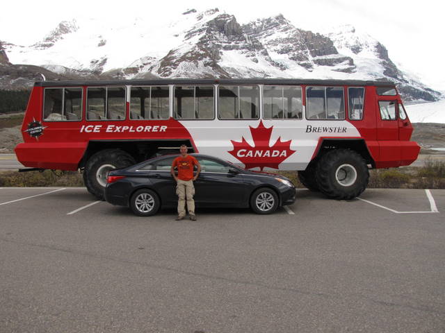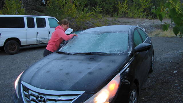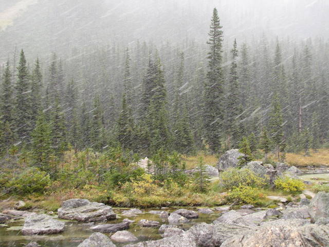 19 september. Dit is een dag waar we het al weken over hebben vandaag gaan we starten aan, volgens de reisgidsen, een van de mooiste autoroutes ter wereld, de Icefields Parkway. Als we de gordijnen openschuiven balen we flink. Het is zo mistig en druilerig dat we de berg op een paar kilometer van het hostel niet kunnen zien. Als dan ook nog een keer de stroom uitvalt in het hostel (en de rest Lake Louise) is de snelheid er ook uit. Met hoofdlampjes wordt gedoucht en geschoren en in halfdonker ontbeten. We pakken de tassen in en om half tien kunnen we vertrekken. De mist trekt een beetje op, waardoor we sneeuw zien liggen op de hoge berg.
