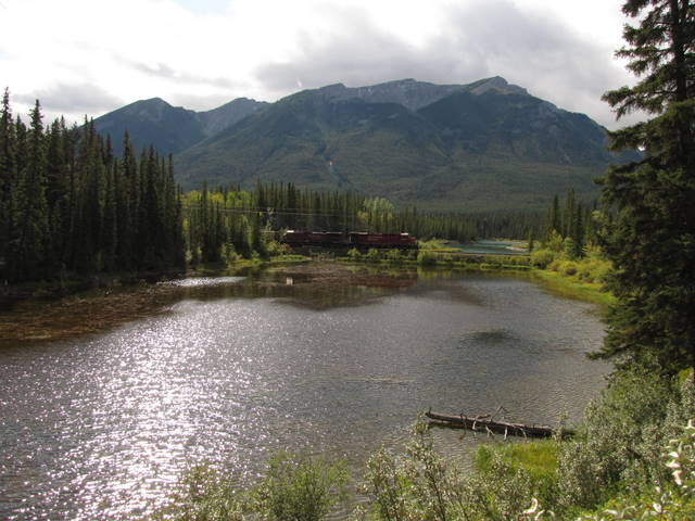 Samen met een kolonne toeristen wandelen we naar de onderste waterval van de rivier. Een oude, door het water uitgeslepen tunnel, zorgt ervoor dat we tot op een paar meter van de waterval kunnen lopen. Natuurlijk lopen wij even door naar de bovenste watervallen wat een klim betekend van een paar kilometer. De meeste toeristen nemen deze moeite niet en het wordt dan ook rustig op het pad. Deze watervallen zijn zeker de moeite waard van de inspanning. Boven nemen we even rustig de tijd om een enorme raaf, die net zo groot is als een kip, op de foto te zetten. Op weg naar beneden breekt eindelijk het zonnetje een beetje door het dikke wolkendek en dat geeft de gelegenheid een aantal foto’s mooier te maken dan op de heenweg. Met de auto vervolgen we onze weg naar Banff. We stoppen nog even bij het Muleshoe uitzichtpunt. Hier loopt een de treindijk tussen een grote waterplas en een meer met helder water door. We hebben enorm mazzel, want net als we een goed plekje hebben om een foto te maken, kondigt een trein zich aan, wat het plaatje compleet in de herfstkleuren.