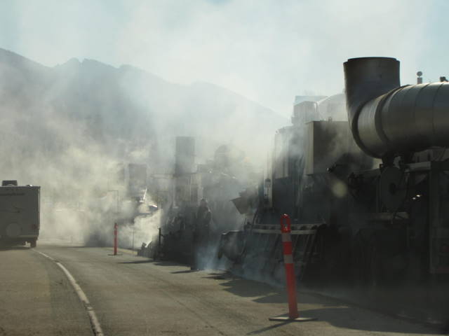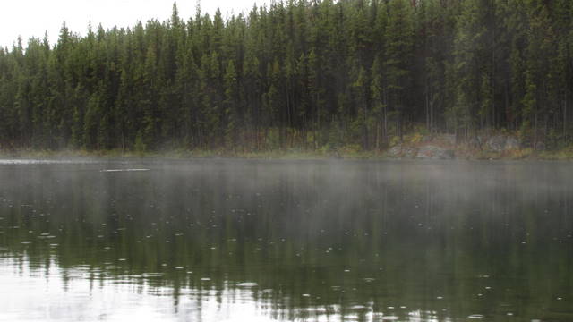 Haal nu de foto van 16 september weer uit je gedachten en zie het verschil. Jammer genoeg blijft het wel druilerig. Door de stroomuitval kunnen we geen parkpas krijgen in het bezoekerscentrum, maar wel aan het begin van de weg. In de hokjes hier hebben ze een aggregaat geplaatst. Op het moment dat we de beroemde weg oprijden trekken heel voorzichtig de wolken uit elkaar. We hebben drie dagen uitgetrokken voor de komende 230 kilometer dus we kunnen de meeste plekken bezoeken die we willen. Onze eerste stop wordt op de picknickplaats van Herbert Lake. Doordat het warme water wordt afkoelt door de kou van afgelopen nacht ( het was rond het vriespunt) is er stoom boven het water te zien. In combinatie met de regen die zachtjes valt geeft dit een dramatische blik die we eigenlijk niet willen.