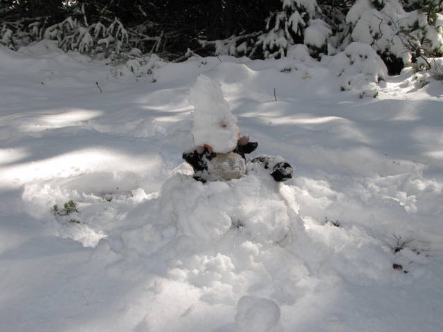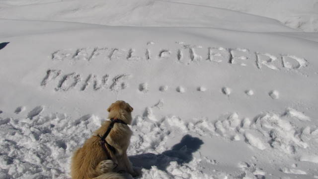 Er loopt een pad naar boven waar nog niet veel mensen gelopen hebben. Door de sneeuw ploegen we tien minuten omhoog. Doordat Erwin zich omdraait precies op het moment dat Rhianne gooit, krijgt hij per ongeluk een sneeuwbal vol in zijn mik (nog bedankt daarvoor). Als de sneeuw uit oren en ogen verwijderd zijn maken we een groet voor Ries en Rianne in de sneeuw. Zij gaven ons de tip voor Peyto Lake. Op deze plek komen bijna geen toeristen meer en het uitzicht is misschien wel mooier dan op het eerdere punt. Schuifelend en glijdend gaan we terug naar de auto en leren Koen nog even hoe het is om ingegraven te zijn in de sneeuw.