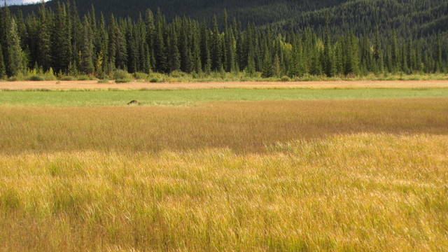 24 september. Vannacht is het droog gebleven en onze Senato Inn heeft prima geslapen. Door onze oogdoekjes was het goed donker en pas om half acht hebben we genoeg slaap gehad. De auto is wat nat binnen ondanks dat het raam opengestaan heeft. Waarschijnlijk komt het doordat het kwik tot onder de zeven graden gedaald is. De airco krijgt droogtrekken niet voor elkaar, dan maar papier uit het toiletgebouw. Om acht uur verlaten we de camping en rijden in een morgen zonnetje en strak blauwe hemel richting het westen. We stoppen bij de Cranberry Marsh Trail. Op de plaats waar lang geleden een gletsjer gelegen heeft is nu een gebied gemaakt met veel watergangen en riet voor watervogels en bevers.