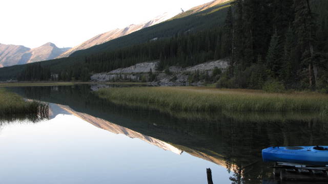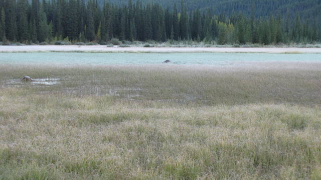We luisteren in de auto naar de weekendcountdown van de meest gedownloade nummers, dit resulteert in de muziek die we doordeweeks ook horen, wat een afwisseling. De Nederlanders die we gisteren ontmoet hebben, hebben in Blue River een bootsafari gedaan met een speedboot om beren te zien. Ze hebben er drie gezien en dat willen wij ook wel, maar niet met een speedboot. Bij gebrek aan een toeristencentrum vragen we bij de plaatselijke camping om andere mogelijkheden. Het wordt met de speedboot voor tachtig dollar per persoon, voor vijftig dollar een kano of wandelen. Aangezien het weer prachtig is en de temperatuur rond de vijfentwintig graden schommelt, beslissen we te gaan kanoën op het Mud Lake. Aangezien de weg er naar toe niet meer is dan een modderig trail krijgen we een oude Jeep mee. We hobbelen in een kwartier naar het meer toe en vinden inderdaad twee kano’s aan een ketting. We kiezen de, in onze ogen, beste uit, droppen de spullen erin en gaan te water. Het is heerlijk warm, geen wind en strak blauw. We blijven dicht bij de kant om onze berenkans te verhogen. Tot aan de waterval met steenstrand zien we geen enkele beer, we hebben dan drie kwartier gepeddeld.
