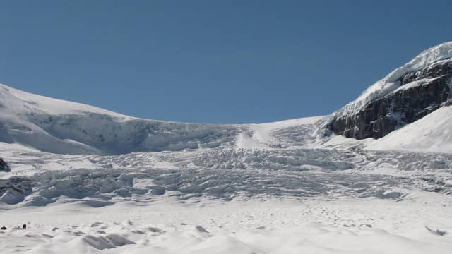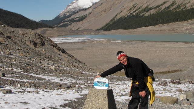 We wandelen op tot een bordje waar het ijs in 1982 lag en krijgen hier een introductie. In totaal gaan we vier kilometer de gletsjer op en kijken voorzichtig in sommige spleten van de gletsjer die heel mooi blauw zijn. We eten een beetje gletsjer ijs en dat smaakt naar… water (inderdaad). We maken in de sneeuw een verjaardagsgroet voor onze zwager Pong die vandaag jarig is en proberen die bij terugkomst via het satellietinternet in het Icefield Centre te versturen. Helaas we kunnen geen bijlages versturen met deze computers. Niet echt handig maar gelukkig krijgen we ons geld voor het computer gebruik terug.