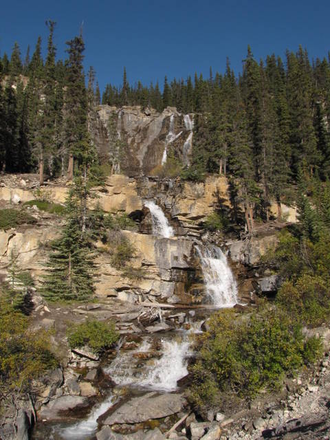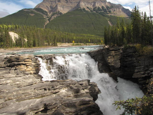 We brengen de spullen dus bij Shauna op het werk en zij zal zorgen dat het bij de juiste mensen terecht komt. Om elf uur kunnen we Golden uiteindelijk verlaten met een goed gevoel. We hebben zeker iets leuks gevonden maar hebben nog budget voor andere projecten. We zijn nog geen kilometer de highway op als we wederom moeten stoppen voor wegwerkzaamheden, het lijkt wel of ze overal nog even snel de wegen winterproof maken. Na een goede twintig minuten vertraging kunnen we eindelijk verder en al snel rijden we het Joho National Park in. De eerste stop hier is de Wapta waterval. De auto gaat op de parkeerplaats en we wandelen een kilometer door het bos tot we het geluid horen van de waterval. Er zit nog genoeg smeltwater in de vijftig meter brede rivier, dus is het over twintig meter neerstortende witblauwe water prachtig om te zien.