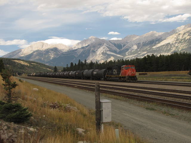 Net voor we het park uitrijden zien we eland lopen, ons eerste grote wildlife in Canada na de orka’s. We maken vlug een foto van de elk die een beetje gevangen zit tussen twee wegen in en rijden dan verder. We stoppen bij een speciale tunnel van de van de Canadian Pacific Railway. Het is een spiraaltunnel die is aangelegd om het stijgingspercentage van het treintraject te verminderen. Bij de aanleg tussen 1881 en 1885 was er een helling gemaakt van 4% waar regelmatig treinen uit de rails liepen. Door de tunnel die een boven- en benedenloop heeft, is het stijgingspercentage teruggebracht tot de gewenste 2%. Wij staan nu bij de benedenloop en hebben goed uitzicht op de twee tunnelopeningen. We hebben mazzel want net voor we weggaan, dient zich een trein aan. In de regen blijven we wachten en dit is zeker de moeite waard. Het is een machtig mooi gezicht hoe, een wederom zeer lange trein, eerst voorlangs komt, dan verdwijnt tussen de bomen en na vijf minuten bij de eerste tunnelopening komt. Na weer vijf minuten komt de trein uit de tweede opening en het achterste deel rijd nog tien minuten voorlangs bij ons.