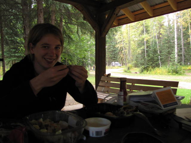 We ontmoeten een Zwitsers stel waarvan de helft geen Engels spreekt. Een mooie gelegenheid om ons Duits onder het stof vandaan te halen. Voor het eerst tijdens ons verblijf in Canada gaat het regenen. Geen kampvuur vanavond maar gezellig bij gasgloeilampjes het verslag bijwerken en lezen. Totale afstand vandaag: 97 km.