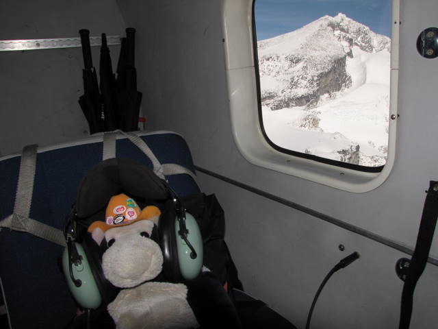 We moeten ons nog twee uurtjes vermaken in het centrum en die tijd wordt onder andere besteed aan het maken van een foto bij de bekende Olympische ringen op het marktplein en aan het zoeken van een kapper voor Erwin. Helaas is er alleen een net niet helemaal kort kapper beschikbaar en dus blijft het haar op sommige plekken wat langer. Net over tweeën gaan we het watervliegtuig in. Beiden krijgen we een plek bij de nooduitgang, altijd een fijn idee. Het opstijgen gaat heel soepeltjes. Eerst een mooi uitzicht over de golfbaan en daarna steeds hoger richting de bergen met sneeuw en gletsjers. Voor het eerst hebben we nu dichtbij zicht op onaangeraakte sneeuw en gletsjers, prachtig!!