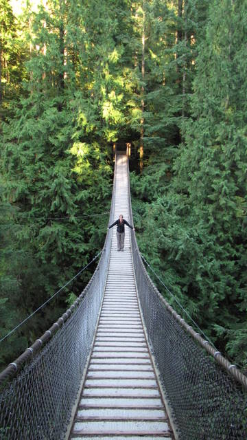 We volgen de Sea to Sky Highway, nummer 99 South. Een mooie weg langs golf van Howe Sound. Toch zijn de uitzichten minder spectaculair als we hadden verwacht maar dat komt waarschijnlijk doordat wij de Rockies gezien hebben. Eenmaal bij het huis van Rob is hij er nog niet. Om de tijd te vullen brengen we een bezoek aan de Lynn Canyon Suspension Bridge. Deze in 1912 gratis brug is een kleinere variant van de zeer toeristische en dure Capilano Suspension Bridge en ligt er slechts een paar kilometer vandaan. De brug hangt vijftig meter boven een diep dal met uitzicht op een waterval.