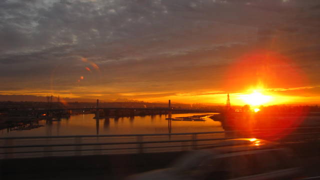 30 september. Al om 6.00 uur zijn we wakker. Vanaf ons hoofdkussen aanschouwen we het begin van de zonsopgang tussen de andere flatgebouwen. Dan is het opschieten geblazen willen we op tijd zijn voor de bus naar Seattle, niet zomaar een bus maar de bordeauxrode Quickcoach. Het begin is niet heel erg quick aangezien we nog minimaal zes keer stoppen in Vancouver. De zonsopkomst wordt steeds spectaculairder en de meest felle kleuren verlichten de stad deze vroege morgen.