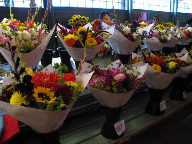 Onze chauffeur geeft ons een voorproefje van de echte typische Amerikaanse humor uit het land waar we heen gaan. Bij de grens krijgen we geen stempel Canada uit, maar staan we gelijk in de rij voor Amerika in. Een beetje spannend is het wel weer. Mogen we al ons eten meenemen en hoe zit het nu precies met een paspoort wat na vertrek nog zes maanden geldig moet zijn? Deze laatste case is actueel aangezien wij onze reis een maand verlengd hebben tot half november en Rhianne haar paspoort begin mei afloopt. Onze douanier is ook nog eens geen makkelijke. We hebben een broekkie en die moet blijkbaar nog bonuspunten scoren. Hij moet zeker weten dat we het land weer verlaten, maar al onze tickets staan online. Gelukkig helpt een beetje glimlachen altijd. De paspoorten blijken geen probleem, na de nodige vingerafdrukken en uiteraard zes dollar p.p. betalen, krijgen we een visum om tot 29 december in Amerika te mogen blijven… We zijn er nog niet helemaal. Even lijkt het erop dat we al ons eten moeten inleveren, zoals de appels en rijst in verband met enge ziektes. Gelukkig zijn de hoeveelheden klein genoeg om alles mee te krijgen. YES, we zijn in Amerika! Terug in de bus verandert het landschap snel, het wordt weidser en er komt meer landbouw. Door de betonplaten is de highway net zo hobbelig als een gemiddelde weg in Vietnam. Dit zorgt ervoor dat het bijwerken van ons verslag niet echt lukt in de resterende twee uur bussen. Eenmaal aangekomen in Seattle mogen we onze zware tassen droppen bij het Western Hotel, de plek waar we uitstappen, wat een service. Het is nu elf uur en we hebben ruim de tijd om de stad te ontdekken. We willen graag een fabriek tour maken door de Boeiing fabriek. Bij navraag blijkt dat dit met het openbaar vervoer nagenoeg niet mogelijk is. We zien een trip van vier uur retour met de bus niet zitten en een georganiseerde tour blijkt extreem duur. Onze vliegtuig plannen gaan uit het hoofd en we gaan in downtown wat leuks zoeken. We beginnen op de Pike Place. Hier zit de versmarkt van Seattle. Veel kraampjes met fruit en groente worden aangevuld met allerlei andere producten. Er kunnen grote bossen bloemen gekocht worden voor tussen de vijf en tien dollar.