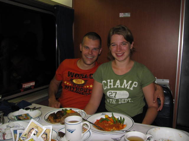 We hebben besloten ons zelf te trakteren op een goed diner en de instant noedels te bewaren tot morgen. Het Japanse koppel bij ons aan tafel is niet erg spraakzaam en pas bij het toetje worden we betrokken bij het gesprek van Amerikanen naast ons. In de tussenliggende tijd genieten we van ons waardig maal die bestaat uit een halve kip met groenten en een aardappel en een spinazie pasta maaltijd. We gaan terug naar onze plaatsen en eindelijk kunnen we het uitzoeken van alle Canada foto’s klaar maken. Nu alleen de filmpjes nog en we zijn weer bij. Om 21.30 is er eindelijk weer wat te zien buiten als we stoppen op een station. Het land is weer vlak en tot we gaan slapen blijft dit zo. Lastig waar te nemen met zeer zelden een lichtpuntje. Rond middennacht nestelen we ons om een paar uurtjes slaap te pakken in de hobbelende trein.