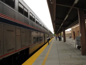 De plaatsen zijn zeer ruim en we kunnen bijna gestrekt liggen op onze ruime banken. We zitten ‘aan kustzijde’ en dat is mooiste kant in de trein. Jammer genoeg hebben we in tegenstelling tot eerdere berichten geen Wi-Fi aan boord. We kunnen dus wel alle foto’s en filmpjes uitzoeken maar ze nog niet back-uppen. Het is behoorlijk bewolkt buiten en dus zijn de uitzichten niet fantastisch te noemen. Regelmatig stoppen we om op tussenliggende stations mensen binnen te laten. Sommige pauzes zijn wat langer en bieden gelegenheid voor behoeftige medereizigers tot een paffie. Op één van de stations staat zelfs een fanfare opgesteld maar het is ons niet helemaal duidelijk voor wie ze spelen. Langs delen van de spoorlijn is het behoorlijk bewoond en soms is het ineens heel uitgestrekt. We passeren een aantal meren met vele soorten watervogels. Net voorbij Eugene Springfield, hier is wereldmerk Nike ontstaan, laten we het vlakke land achter ons en gaan de heuvels in. Het zicht wordt beperkt door de bomen en heel soms kunnen we een glimp opvangen van een meer, rivier of weg. Tussen de hoge bomen wordt het nog sneller donker en als we om 19.00 uur onze gereserveerde plekken in de restaurantcoupé opzoeken is het buiten donker.
