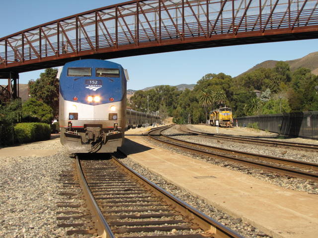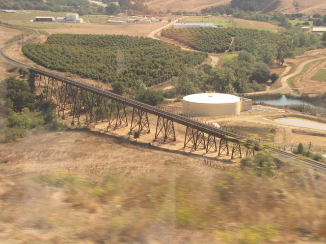 Hier is het uitzicht een stuk beter en we ontmoeten daar Ken. Hij weet allerlei leuke weetjes over de omgeving te vertellen en dat is een onverwachte toevoeging. We zien een grote olieraffinaderij en daarna wijngaarden. Het land is hier heel vruchtbaar ondanks dat het buiten de boomgaarden heel goudgelig verkleurd en dor is. Tussen San Francisco en Los Angeles zijn door de Spanjaarden vele ‘missions’ gesticht, of te wel plaatsen waar men het christendom heeft verspreid. Op ongeveer elke dertig mijl is er een plaatsje wat begint met ‘San – ’. Zo ook Santa Barbara waar Ken de trein verlaat. Niet lang daarna gaan we een lange tunnel in en van het ene op het andere moment is het landschap bergachtig. We rijden op de rand van een vallei en ver onder ons bevindt zich de highway. Net voor San Luis Obispo bevindt zich Horseshoe Curve of te wel een mooie hoefijzervormige bocht.