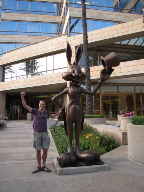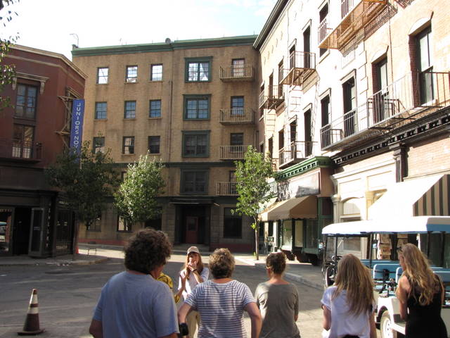 Daarna wachten we ruim drie kwartier op de stadsbus die ons naar de Warner Bros Studio’s brengt. Hier gaan we een tour maken door de het grote studiocomplex. In een uit de kluiten gewassen golfkarretje worden we het terrein overgereden en gelukkig maar want dit was teveel om te wandelen. Op het buitenterrein zijn de gevels van een heel Amerikaans dorp nagebouwd met winkels, pakhuizen e.d. Hier worden de buitenopnames gedaan.