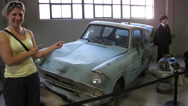Dit is een mooie overgang naar één van de studio’s. Op het complex staan het mooie aantal van 29 opnamestudio’s. Dit zijn eigenlijk grote hallen waarin de decors opgebouwd worden. Een aantal is even groot als een vliegtuig hangar en één heeft een enorme ondergrondse watertank. Op elke hal is te zien welke producties er zijn gedraaid. Wij brengen een bezoek aan de hal waarin Chuck is opgenomen. Een Amerikaanse serie. De laatste twintig minuten brengen we door in het Warner Bros museum. Dat is net te kort en we spenderen de meeste tijd daarom op de eerste verdieping waar echt veel attributen uit de Harry Potter films te zien zijn. Zo is daar de bezemsteel Nimbus2000, het kostuum van Hagrid waarin hij Harry Potter als baby draagt en de versteende Hermelien. Deze is volledig nagemaakt van siliconen zelfs de handhaartjes ontbreken niet. Er is zelfs een mogelijkheid om Hogwarts beroemde sorteer hoed op te krijgen die bepaald dat Rhianne Griffoendor is en Erwin Zwadderich, we passen dus lekker bij elkaar. In de vijf minuten die overblijven, roetsjen we door het beneden gedeelte waarbij we kostuums van de Matrix en het prototype van de Badman Mobile. Jammer genoeg mogen we in het museum ook geen foto’s maken. Eenmaal terug bij het hoofdkantoor waar de tour begon zijn we twee en een half uur weggeweest. Als Erwin nog een nieuw shirt gekocht heeft aanvaarden we de terugweg.