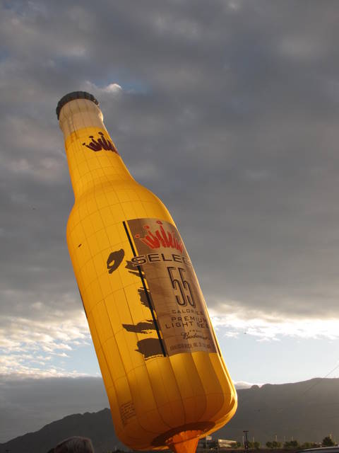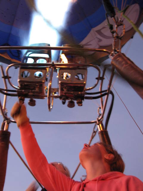 Erwin ontdekt dat een van de compact camera’s van de crew nog in zijn jaszak zit. Oeps, die leveren we vanavond in bij de gevonden voorwerpen. We pakken de bus naar het Route 66 hostel, die langs de bekende Amerikaanse weg, in het hartje van Albuquerque staat. In het hostel blijkt dat ook vanaf hier slecht openbaar vervoer is naar het veld of één van de transferplaatsen. Gelukkig zijn er net twee Amerikaanse meiden met een eigen auto aangekomen en die graag naar het festival willen. Wij spreken af hun kaartje te betalen van zes dollar als we mee mogen rijden. Prima geregeld! Zo kunnen we halverwege de middag op weg naar het terrein voor de nightglow, het in het donker oplichten van de ballonnen die aan de grond blijven. We proberen weer een piloot te scoren om te helpen. Ondanks dat we drie namen krijgen lukt dit wederom niet. Rhianne spreekt dan het team van King Jorden aan als ze bezig zijn hun ballon uit de aanhanger te slepen. Deze mensen vinden het leuk om ons te leren hoe een ballon opgebouwd wordt en we kunnen eindelijk aan de gang. Zoals altijd in Amerika en Canada moet een waiver getekend worden dat het bedrijf niet aansprakelijk is voor ongelukken. De brander wordt op de mand gemonteerd en getest. Uiteraard mogen we zelf de knopjes bedienen van het gat en dat is best cool (lees warm). Dan wordt de envelop (het nylondoek van de ballon in vaktermen) uitgespreid. Bij het inblazen van de koele lucht met de ventilator mag Rhianne de onderkant van de balloon openhouden. Voor Erwin is een ander klusje bedacht. Hij mag het touw vasthouden wat aan de top van de ballon bevestigd zit en voorkomen dat de ballon de verkeerde kant opwaait of in elkaar zakt. Dit klinkt best stoer maar wordt na vijf minuutjes hangen een pittig karweitje. Gelukkig houdt een ander crew lid een oogje in het zeil. Als de ballon omhoog komt is deze alleen nog te houden met een extra handje van de 120 kilo zware Amerikaan en zijn er tien minuten nodig om bij te komen van de kramp in de armen. Maar gaaf was het. Rhianne is inmiddels in de mand gekropen en regelmatig worden de gaskranen opengetrokken.