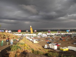 7 oktober. De wat langere nachtrust heeft ons goed gedaan. Ondanks dat we om 5.00 uur opstaan zijn we redelijk wakker en vol energie. De lucht is bewolkt maar het is droog en er is geen wind. Bij onze overstap blijkt het droog zijn van korte duur, de weg is nat en niet veel later begint het opnieuw te regenen. Dit houdt aan tot we op het ballonnenveld zijn. Ondanks dat wij pas om 6.30 uur arriveren is er nog geen ballon uit de auto. Er wordt duidelijk gewacht op de weersvoorspelling. Onze piloot heeft blijkbaar al besloten om niet te komen aangezien hij niet op het veld is. Wij willen toch graag helpen en gaan bij het kantoortje van de crew vragen of we ergens anders van dienst kunnen zijn. We krijgen een andere piloot en net als we concluderen dat ook hij niet op het veld is worden de ochtend vluchten gecanceld. Pas als het een halfuur later droger wordt worden er ballonnen gevuld, die gewoon aan een touw op de grond blijven. Dan blijkt wel hoe groot het evenement is, meer dan veertig ballonen dansen binnen een halfuur op wind.