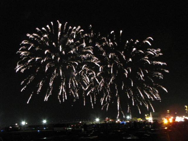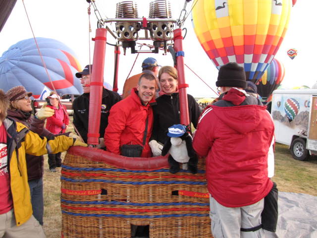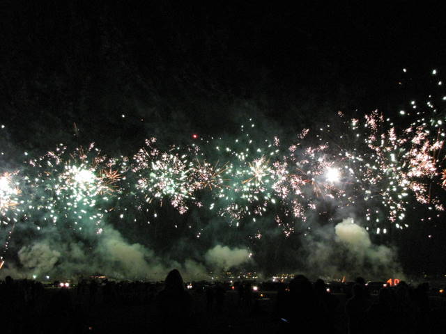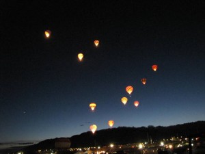 Rondom onze ballon reizen steeds meer andere op en terwijl het langzaam helemaal donker wordt vult het veld langzaam op. Meer dan honderd gewone ballonnen en een aantal speciale vorm ballonnen lichten om de beurt om. Fantastisch. Ook Erwin is inmiddels in de mand en bedient knopjes. Tijdens dit festival mogen toeschouwers tussen de ballonnen inlopen en dat is super leuk en gezellig maar lastig als de ballon na een uurtje moet worden opgeruimd. Overbodige mensen worden aan de kant gestuurd en tien mensen zijn nog om rondom de in elkaar zakkende ballon te staan. Gelukkig de meeste mensen weten hoe het werkt en er loopt niemand over het nylon heen. Net als we de ballon in de auto geschoven hebben start het vuurwerk. Samen met tienduizenden andere mensen kijken we de show waarvan vooral de “grand final” fantastisch is. Heel tevreden over de avond gaan we terug naar de auto waar we onze twee Amerikaanse vrienden vinden. Het duurt bijna een uur voor we de parkeerplaats af zijn maar dan zijn wel heel snel terug bij het hostel en kunnen we slapen.
