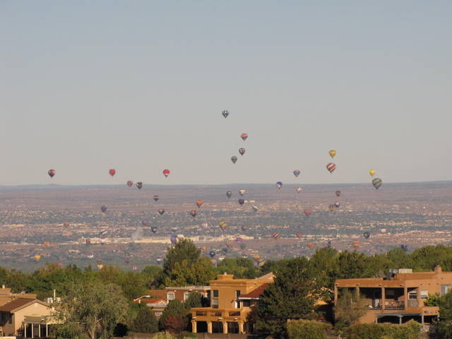 De tijd vliegt voorbij in de trein en voor we het weten kondigt de luidspreker Albuquerque aan. Wederom ruim een halfuur voor op schema komen we aan op het station. We mogen onze tassen op het station laten en dat scheelt een hoop sleepwerk. Stapelwolken zorgen voor ideaal afritsbroeken weer. Het is 79 graden in het zonnetje en we maken een korte broek. Als onze vriend achter de wolken verdwijnt en de wind een beetje opzet koelt het een flink aantal graden en trekken we snel weer wat warms aan. Onze eerste missie is het visitorcentrum zoeken. Volgens de loketbediende op het station bij de eerste stoplichten links, jaja. Wederom een extra keer vragen en twintig minuten zoeken komen we bij het hoofdkantoor van toerisme Albuquerque op de zesde verdieping van een kantoorpand. We worden wel erg goed geholpen en de noodzakelijke kaart maakt oriënteren een stuk makkelijker. Op advies gaan we naar Old Town. Dit gedeelte ligt naast downtown en is zoals de naam doet vermoeden het oudste deel van de stad. Doordat het luchtballonnenfestival gehouden wordt zijn er extra activiteiten en is er een gezellige drukte. We nemen ruim de tijd om de vele boetiekjes en winkeltjes te bezoeken. Eén van de shopjes heeft een collectie van duizenden hete luchtballon souvenirtjes.