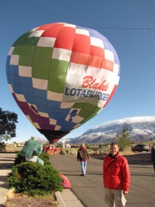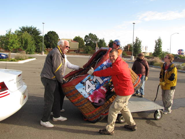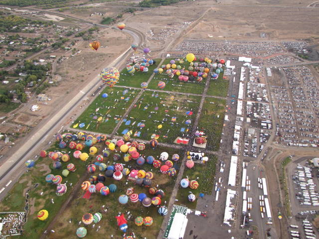 Steeds meer ballonnen doen dit spelletje en op de brug staan tientallen auto’s stil om dit te aanschouwen. Wij gaan ondertussen weer terug naar 900 meter hoogte om nog even over het weidse Albuquerque uit te kijken. Dan is het tijd om een spot te vinden om te landen. Die zijn er genoeg maar er zijn ook veel ballonnen. De ene land in een park, de ander op het parkeerterrein van een grote shoppingmall. Wij vinden ook een mooie plek op een parkeerterrein en na ruim anderhalf uur staan we strak tussen twee lantaarnpalen weer aan de grond. Al snel is de crew ook op onze plek en wordt de ballon ingeladen.