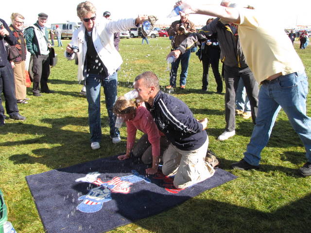 Met de volgauto gaan we terug naar het festivalterrein. Hier wordt een lunch opgebouwd en drinken we een zelf gebrouwen kaneel achtige substantie. Als we denken dat het klaar krijgen we nog onze luchtvaartceremonie. We nemen voor onze zittende piloot plaats op een kleed en hij verteld ons het ontstaan van de ballonvaart. Als we uiteindelijk weten dat het eind 18e eeuw een kip, schaap en een eend de eerste ballonvaarders waren is het tijd voor champagne. Onze plastic bekers mogen we niet met de hand vastpakken dus we moeten knielend drinken. Precies op het moment dat we drinken worden we vanachteren nat gegooid met water. Onze luchtdoop is compleet.