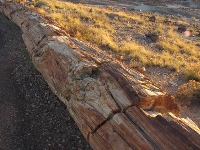 De versteende tropische bomen zijn 225 miljoen jaar oud en ontstaan in de tijd dat de dinosaurussen nog rondliepen op de wereld. Doordat het aardplateau hier omhoog is gekomen en het water canyons heeft geslepen zijn de bomen aan het oppervlak geraakt. Ontelbaar veel dikke jongens zijn er te zien met de prachtigste kleuren van binnen. Helaas wordt er volgens het introductiefilmpje elke maand een ton aan hout meegenomen. Vooral in de eerste jaren na ontdekking zijn er vrachtwagens vol hout gestolen. De oude Route 66 ging dwars door het park heen. Nu staan er zware straffen op het meenemen van een piepklein stukje variërend van een boete van $325 tot gevangenisstraf. Iedereen krijgt zelfs een papiertje bij de ingang waarop je anderen kan verklikken. Onderweg zien we dan ook een keer dat een patrouille auto iemand aanhoudt die de auto overhoop mag halen. Helaas is er zoveel te zien en te doen dat het ons niet lukt om alle stukken van het park te bekijken. Als het park sluit hebben we het museum met een aantal wandeltrails nog niet kunnen zien.