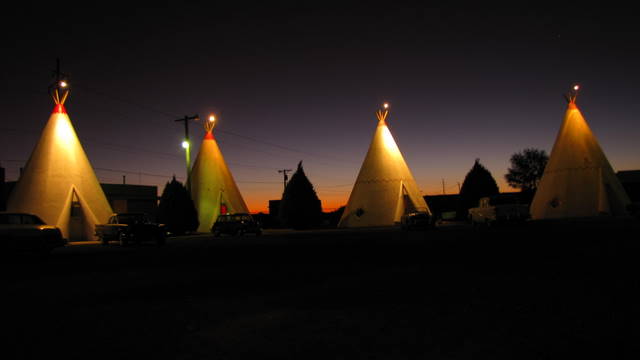 Bij de McDonalds checken we de email en kopen voor één dollar wederom twee liter Sprite. We blijven geld uitgeven en kopen voor vijfentwintig dollar iets meer dan zeven gallon brandstof, in dit geval genoeg om de auto vol te tanken. Terug bij de wigwam werken we nog even het verslag bij en gaan dan uit eten bij Butterfield Stage Co Steak House. Dit is een steakhouse volledig in Western Style. Het neonbord buiten vertoont, zoals wel meer neon langs route 66, wat kuren, maar binnen is het tiptop. Elke tafel heeft twee banken met afscheiding. Bovenop zijn grote buffelhoorns gemaakt. Net als de kleine postkoetsen, wildwest verhalen, cowboyhoeden maakt dit de stijl compleet. Terwijl Rhianne een reusachtige sparerib probeert meester te worden doet Erwin zich te goed aan een mixed grill. Uiteraard sharen we het één en ander met elkaar. Aangevuld met de saladebar zitten we meer dan vol. Bijna rollend gaan we terug naar de auto die ons weer netjes in onze wigwam brengt. Totale afstand vandaag: 11 mile.