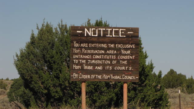 17 oktober. Na een verfrissende douche zijn we goed wakker en kunnen, nadat we even snel ons middageten gehaald hebben en de ruiten van de auto een grondige poetsbeurt gegeven hebben, op pad. Net buiten Holbrook pakken we highway 77 en al snel zien we dat we het Navajo Indianenreservaat inrijden. Er is slechts één verkeersbord die aangeeft dat we in Navajo zitten en dat hier de Navajo wetten gelden en verder veranderd er niets. De weg blijft het zelfde net als de verkeersborden en ook het dorre weiland loopt gewoon door. We doorkruisen het reservaat met vele mooie canyons over een oneindig lange weg. Na ongeveer vijftig mijl geeft een ander bord aan dat we het Hopi-reservaat in rijden.