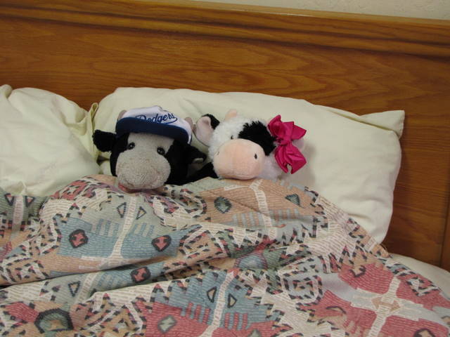 Hier zijn we het niet mee eens en na wat aandringen, krijgen we de sleutel van een Hyundai Accent die in de compact klasse zit. In de praktijk blijkt deze qua maat ongeveer even groot als de Kia maar er zijn geen haren en de auto is 10.000 mijl jonger. We gaan het ermee doen ondanks het ontbreken van centrale vergrendeling, elektrische ramen, temperatuurmeter… een beetje uitgekleed is het wel. Via het hostel waar we nog een uurtje of twee de route plannen rijden we naar het informatiebureau voor aanvullende informatie. Vanaf hier gaan we even kijken bij een modelspoor hobby winkel die weinig spul blijkt te hebben en naar een hele leuke speelgoedwinkel. Hier rijd zelfs een houten trein langs het plafond van de winkel. Het is in deze winkel dat er iets opmerkelijks gebeurd. Normaal gesproken blijft Koen als een goede reisgenoot dicht bij ons in de buurt, geeft soms zijn bescheiden mening als hij denkt dat iets anders kan en doet vooral veel en goed werk met zijn projecten. Nu is hij niet weg te slaan bij één van de vele schappen die de winkel rijk is. Als wij goed kijken blijkt hij in diep gesprek te zijn, met… een schattige koe die zijn hart op hol heeft doen slaan en haar naam is Lilly. Wij denken dat het beter is dat Koen een Nederlandse vriendin krijgt maar daar denkt hij zelf anders over. De keus wordt hij blijft hier of zij gaat mee. Dan kiezen we na wat wikken en wegen voor de laatste optie, mits hij zijn werk maar goed blijft doen. Nog een beetje aan het bijkomen bezoeken we één van de grootste supermarkten die we tot nog toe gezien hebben in Amerika en sprokkelen daar ons avondeten bij elkaar. De meeste verpakkingen zijn Amerikaans groot maar gelukkig, we hebben weer een auto! Taart is hier erg goedkoop dus voor het budget wat we gekregen hebben kunnen we dagen vooruit. Ook kiezen we wat alcoholische drankjes uit voor een toast, want dat hoort erbij. Terug in het hostel prepareren we ons avondeten en maken een nieuwe post klaar voor de website. De taart van vandaag is een mega brownie met chemische versiersels. Met een lekker drankje erbij maakt dit de feestdag compleet terwijl de jarige in Nederland allang op één oor ligt. Totale afstand vandaag: 20 mile.