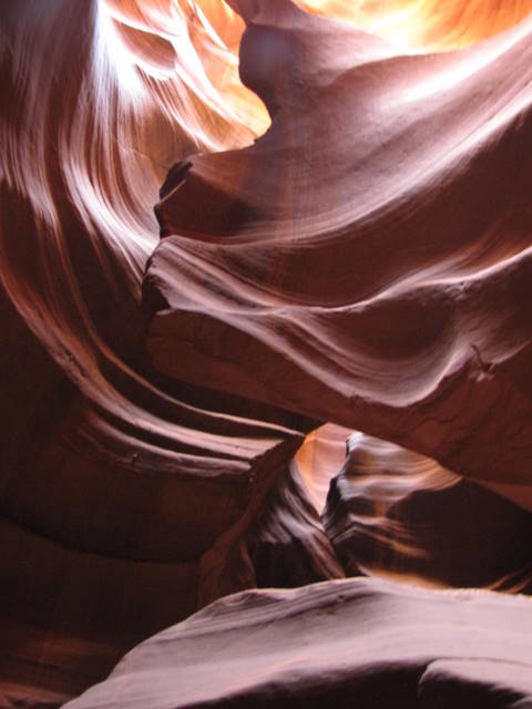19 oktober. Aan het ontbijt met ei en verschillende soorten cornflakes beslissen we een dag langer in de buurt van Page te blijven. Er is teveel wat we graag willen zien. Na even skypen met de ouders van Rhianne starten we met een tour door de Antilope Canyon. In een 4×4 rijden we vanaf de parkeerplaats door een grote zandweg, grappend genoemd de Navajo Highway. De canyon zelf is van meer dan ongekende schoonheid. Gisteren vonden we het jammer dat we niet alleen konden ontdekken nu vinden we het minder erg. De canyon is onbeschadigd en onze gids blijkt erg goede fotografie tips te kunnen geven. De canyon is een slotcanyon wat inhoudt dat deze van boven nagenoeg gesloten is en beneden iets ruimer. Door de kurketrekkerachtige vormen is het bijna onmogelijk om lelijke foto’s behalve dan als ze bewogen zijn of met flits gemaakt worden. Er zijn heel veel verschillende kleuren rood, geel en oranje te zien. In onze groep blijken een aantal mensen met dure camera’s rond te lopen die niet eens weten hoe ze de ISO waarde moeten aanpassen. Beetje jammer en gelukkig voor die mensen maakt onze gids met hun camera’s wel prachtige foto’s. We zullen er hier een paar plaatsen en de rest komt te zijn er tijd in de gallery van de website.