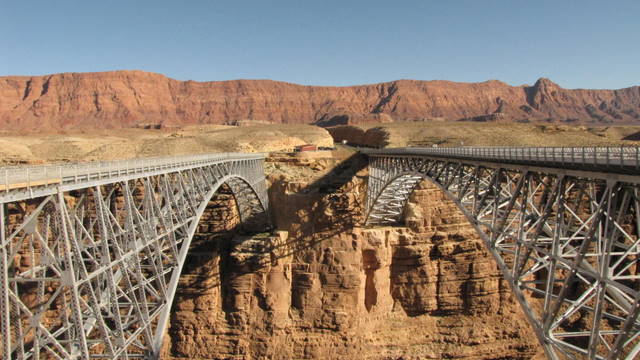 Namelijk de Navajo brug of beter gezegd Navajo bruggen. Direct naast elkaar liggen twee bijna identieke grijsstalen boogbruggen alleen hebben ze een leeftijdsverschil van 65 jaar. Deze tweeling is een belangrijke noord-zuid verbinding in Arizona. We wandelen een poosje rond en gaan dan door naar Marble Canyon. Hier is nog een mooi uitzicht op een paar kleine canyons. We aanvaarden dan de terugweg naar Hope. Op het formidabele uitzichtpunt beslissen we de zonsondergang af te wachten en alvast een stel foto’s uit te zoeken. Terug bij onze Inn maken we de heerlijke kip-spinazie-champignon-magnetron-lasagne klaar. Aangevuld met mini pannenkoekjes, die wij voor het gemak poffertjes noemen, als dessert een prima avondmaaltijd. Totale afstand vandaag: 93 mile.