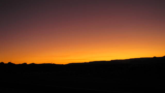 21 oktober. We hebben prima geslapen in de auto ondanks dat de temperatuur rond het vriespunt lag. In het oosten begint het een beetje licht te worden dus moeten we opschieten voor de zonsopkomst. We rijden weer naar het Yavapai Geology Museum om bij de zelfde canyon als gisteravond de zonsopkomst te kijken.