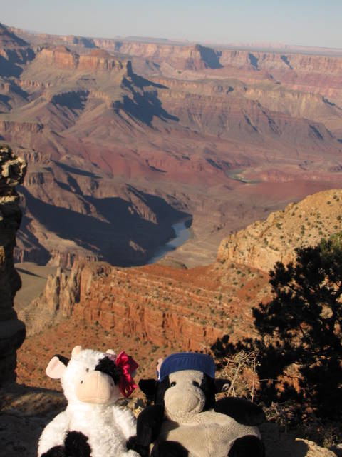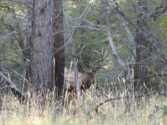 We beklimmen ook de uitzichttoren met 85 traptreden en mooie schilderingen. Het volgende punt is het Navajo punt met 2275 meter het hoogste punt op de Oost Rim. Dit punt kijkt uit over veel kliffen met namen van stammen en zit ongeveer drie tot vier mijl af van de Colorado rivier ondanks dat het veel dichterbij lijkt. Op het Lipan Point vliegen de haviken over naar de Noord Rim en zien we een blauwe waas over de canyon. Bij het Tusayanmuseum en bijhorende ruïnes zien en leren we meer over de pueblo’s (woningen) van Tusayan Indianen. We zien zelfs de ruïne van een uit twee verdiepingen bestaande pueblo gemaakt eind 1100. We bezoeken Moran point en het Grandview point wat sneller, aangezien we op tijd willen zijn voor de zonsondergang. Op Moran point kan acht mijl ver de de canyon ingekeken worden en het Grandview point is zeer populair omdat zowel de oost als de westkant kan worden gezien. Net na dit punt zien we een verkeersbord van een bergleeuw, die we nog niet in de fotocollectie hebben. Door het achterop komend verkeer lukt de foto niet en direct hierna ziet Rhianne in een bocht een hert in het struikgewas. Die wil Erwin ook zien en hij draait de auto. Dan gebeurt een dramatisch moment. Net voor de bocht steekt een kamikaze eekhoorn met zelfmoordneigingen vlak voor de auto aan passagierskant over. Rhianne die hem ziet slaat de handen voor ogen, Erwin rijdt door en hoort alleen “kloenk, kloenk” onder de auto. Hij ziet de mooie eekhoorn pas in zijn achteruitkijkspiegel, stil… In de bocht is het hert inmiddels niet meer te zien. We keren nogmaals de auto om weer in goede richting te komen en helaas blijft de eekhoorn liggen. Even verderop zien we een auto in de kant staan. We kijken goed en zien twee mooie grote elken in het struikgewas.
