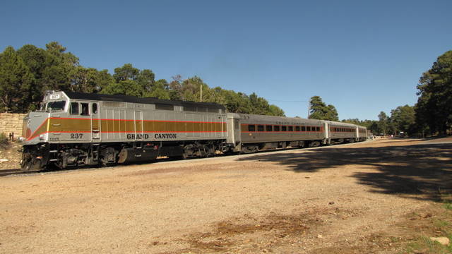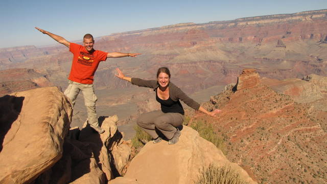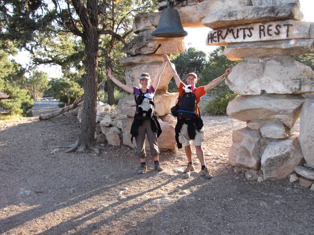 Dit is een stuk pittiger aangezien de schaduw verdwenen is en de zon fel op onze huid brand. Maar in tegenstelling tot de beloofde drie kwartier zijn we al in vijftien minuten op het eerste uitzichtpunt en binnen het uur staan we weer boven. Opgeteld bij het halfuurtje afdalen zijn de twee tot vier uur zijn dus erg ruim genomen. Op ons gemak rijden we naar Grand Canyon Village om hier een aantal foto’s te schieten van de Grand Canyon trein richting Williams. Daarna pakken we een bus richting Hermits Rest. Onderweg stappen we een aantal keren uit om foto’s te maken van de canyon aan de westelijke zijde. Aangezien de pendelbussen ieder kwartier komen lopen we van punt naar punt en dan weer een stukje met de bus. Bij het eindpunt aangekomen luiden we natuurlijk figuurlijk de bel voor onze prestaties van vandaag.
