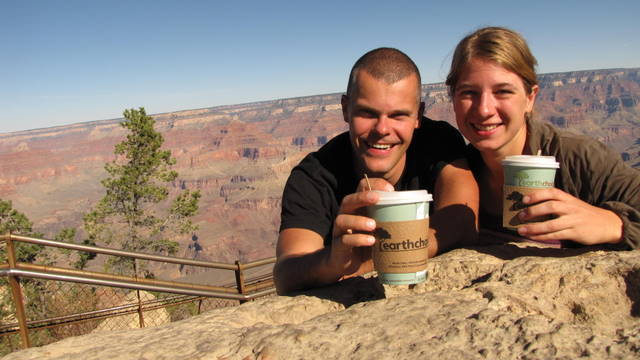22 oktober. We beginnen onze draai te vinden in onze Hyundai slaap lekker en ondanks de koele temperaturen zijn we aardig uitgeslapen. Gisteren is de warme choco goed bevallen, dus vandaag zitten we weer in het café. Op een rotspartij bij het Matherpoint, dichtbij het bezoekerscentrum eten we ons ontbijt. Met de laatste aanblikken over de Grand Canyon kunnen we gelijk zien waar we gisteren gelopen hebben.