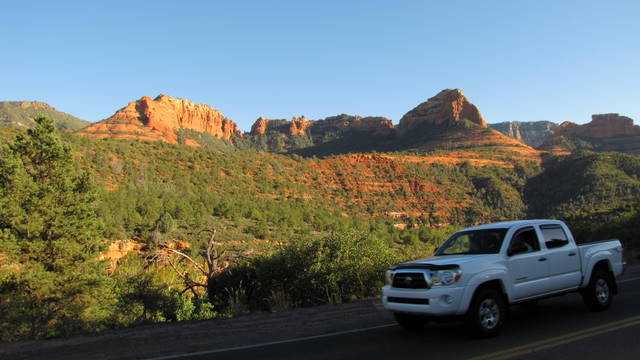 Dit betekend ook dat de campings snel vol zullen zijn vandaag en we dus eerst een plekje voor de nacht moeten regelen. De eerste camping Pine Forest geeft aan nog wel wat plek te hebben, maar zij hebben geen douches. De parkranger hier belt netjes voor ons naar de volgende camping en daar zou waarschijnlijk nog wel plek zijn. Dit blijkt lastiger dan gedacht en we moeten twee rondjes over de camping rijden voor we één van de laatste twee plekjes kunnen bemachtigen. Dan alsnog door naar Sedona. Onderweg zien we veel mooie rode rotspartijen die bij de dalende zon nog voller van kleur zijn. Vier mijl voor de stad rijden we een file in die ons slechts stapvoets verder brengt. Het geeft wel mooi de gelegenheid om foto’s te maken en we zien mensen zelfs buiten de auto hangen.