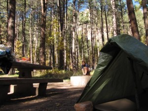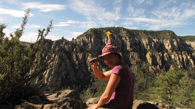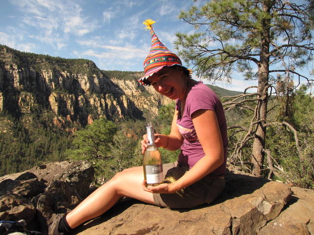 Na het ontbijt wordt de auto ingeruimd. Bij de receptie gebruiken we de telefoon om voor woensdag de verjaardagsactiviteit te reserveren, helaas is het vol. Even de planning wederom omgooien en het wordt nu zaterdag. Benieuwd wat we gaan doen? Nog even wachten dan… De middag gaan we besteden met een wandeling door de mooie herfstkleuren van het Coconino National Forest. We beklimmen de trail naar Harding Springs. Onderweg zien we een gigantische eekhoorn. Pittig stijgen en dan komen we uit op een natuurlijke uitzichtpunt. Ineens hebben we bereik en er komen een aantal smsjes hier knallen we de champagne open. En met recht knallen, want de dop schiet toch zeker 10 meter hoog en komt 29 stappen verder pas weer neer (don’t try this inside home). Aangezien Erwin nog moet rijden is de alcohol uit de champagne gehaald, zoals op de fles staat.