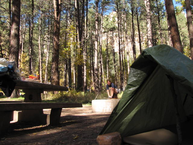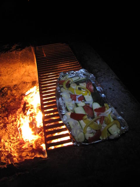 We doen bijna een uur over het stukje en zijn tien voor vijf in het bezoekerscentrum. Hier zijn de mensen blijkbaar met de gedachte al bij de vrije avond want ze helpen ons onvriendelijk en gehaast. Uiteindelijk vinden we op eigen kracht een grote supermarkt waar ons avondeten bijeen geshopt wordt. Vanavond gaan op het kampvuur gevulde champignons, mais en vlees. Dit wordt aangevuld met door de sla heen gemixte aardappelsalade. Als we weer wat marsmallows hebben gebakken en heet water voor de thee in een blikje hebben verwarmd gaat het vuur uit en wij onze frietzaktent in. Totale afstand vandaag: 136 mile.