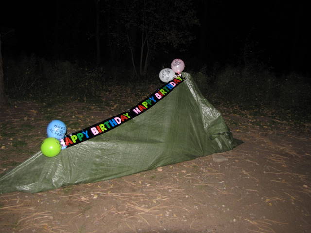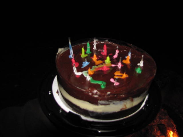 ’s Avonds zijn we net iets later terug op de camping als gehoopt. Het is al goed donker als we met behulp van de koplampen van de auto het kampvuur aanmaken. Met wederom één lucifer en onze lokale spiritus: afgevallen dennennaalden, gaat het vuur binnen no-time als een razende. Voor we het weten hebben we genoeg vuur om onze speciale verjaardagsmaaltijd te maken. Twee grote stukken biefstuk, een kipfilet en een ratatouille van courgette, paprika, ui en tomaat aangevuld met salsasaus worden bereid. Als toetje hebben we magnetronpopcorn van het kampvuur (wat helaas niet helemaal werkte) en yoghurt. Na het eten is het tijd voor de verjaardagstaart. De eerder gekochte taart is door Erwin opgeleukt met magische kaarsjes, lees: die van zichzelf SLECHT uit gaan. Na veel te vaak blazen blijven de kaarsjes opnieuw aanspringen. Toch wel een grappig gezicht (voor Erwin). De overheerlijke chocoladetaart maakt ons aardig vol. Het kampvuur wordt minder, dus een mooie tijd om te gaan slapen. Echter Erwin is nog ‘even’ bezig waardoor Rhianne niet bij de auto mag. Als service krijgt Rhianne al haar spullen één voor één aangereikt. Ze kan nu vast gaan slapen en dat komt Erwin goed uit om de verrassing van morgen af te maken. Totale afstand vandaag: 33 mile.