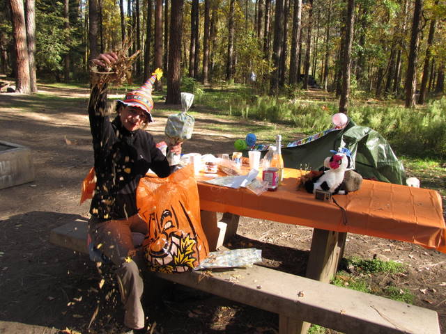 24 oktober. Om zeven uur worden we wakker. Happy Birthday to you, happy birthday to you…. Rhianne is nu ook in Amerika officieel jarig en Erwin zingt dan ook het Engelse verjaardagslied. Rhianne ontdekt na een tripje naar de wc dat onze frietzaktent helemaal versierd is met slingers en ballonnen. 21?? Nee hoor, alleen dat waren de ballonnen die we nog bij ons hadden. Erwin heeft er dan ook netjes 23 van gemaakt! Nog even lekker liggen en wachten tot de zon achter de bergen vandaan komt om de dag weer heerlijk op te warmen. Erwin gaat er even later uit om het ontbijt te maken. Bijna een uur later is het tijd om aan te schuiven. Op een oranje tafelkleed staat een heerlijk ontbijt uitgestald inclusief warme chocomelk, gisteren in het kampvuur gekookte eitjes, stokbrood en een heuse appelcake gaan er prima in. Koen en Lilly zijn ook aanwezig en maken het feest compleet.