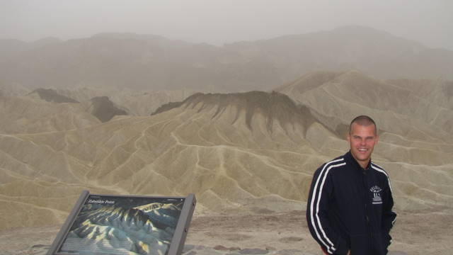 4 november. Met wat moeite gaan de ogen rond negen uur weer open. We gaan vandaag doorreizen en hebben eigenlijk geen tijd om langer uit te slapen. Onder de net te lage maar wel warme douche verfrissen we ons. Het inclusief ontbijt is net als de rest van het hotel karig. Er zijn twee soorten cornflakes en melk en that’s it. Met onze eigen yoghurt, brood en ham leuken we het ontbijt op. Dan rijden we de lange Sahara Avenue af naar een hobby- en modelspoorwinkel. Hier hebben ze erg mooie dingen en uiteraard verlaten wij met een tasje de winkel. Via Scenic Road 159 verlaten we Las Vegas met het idee om Red Rock Canyon park naar de mooie bergen te kunnen kijken. Er is alleen een probleem, boven de bergen hangen grote wolken en er valt zelfs regen uit. Dit hadden we op het randje van de woestijn niet helemaal verwacht. Als we in hoogte gaan stijgen, komen we zelfs in een flinke sneeuwbui terecht. In vuurwerkstad Pahrump slaan we boodschappen in voor de komende dagen en rijden dan via Death Valley junction het park in. We verwachten eigenlijk dat we bij het naderen van de Death Valley beter weer gaan krijgen maar niets is minder waar. Het blijft bewolkt en flink waaien. Dit merken we vooral als we even op het Zabriskie uitzichtpunt gaan kijken. Dit is normaal gesproken één van de warmste plekken op aarde maar wij bevriezen zowat en waaien vanzelf weer naar de auto.