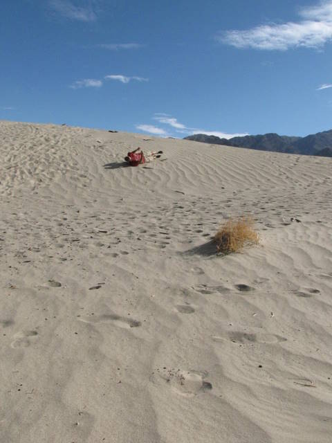 Een andere mooie weg die gereden kan worden is het Artist Palet. Deze nauwe weg is slechts in één richting te rijden en voert langs rotsformaties van allerlei kleuren. Bij het Artists Palet zitten al deze kleuren kort bij elkaar als op een echt schilderspalet. De weg naar beneden maken we nog een filmpje terwijl Rhianne stuurt en Erwin de pedalen bedient. Ook de Salt Creek kan alleen bereikt worden door een stoffige gravelweg te bereiden. In het voorjaar kan hier de zeldzame pupfish gespot worden. Nu aan het begin van de winter is er nog best een fors stroompje te zien maar geen wildlife. Bij de Mesquito Flat Sand Dunes vermaken we ons ook nog een hele poos. Deze geelwitte zandduinen bieden dan ook wat speelgelegenheid en fotomomentjes. Net als in het rode zand in Namibië rolt Erwin ook hier naar beneden met als resultaat overal fijn zand. Koen laat Lilly ook het zand zien wat resulteert in twee zanderige koeien. In Stovepipe Wells Village vragen we bij de rangerspost hoe we het beste onze vervolgroute kunnen gaan doen aangezien we nog naar Yosemite en Sequia & Kingscanyon NP willen. We horen dat de doorgaande weg door Yosemite inmiddels is gesloten door sneeuwval en dat we dus eerst naar Sequia en Kingscanyon NP gaan. Aangezien dit nog een flink stuk rijden is en er maar weinig slaapgelegenheden onderweg zijn beslissen we Death Valley te verlaten.