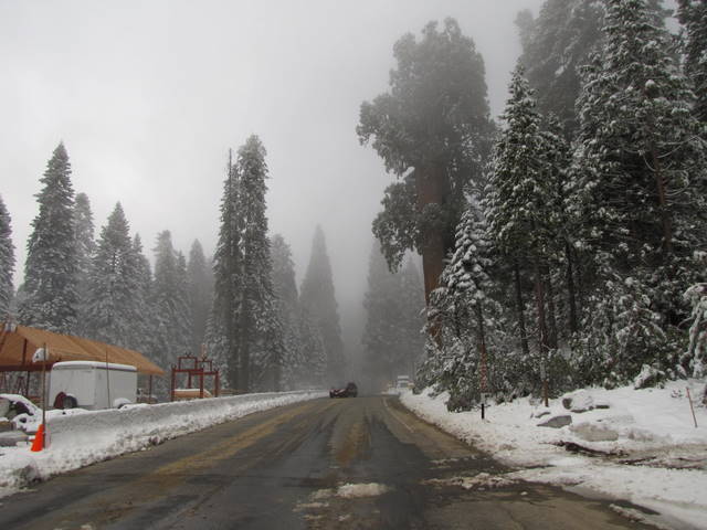7 november. Als we de gordijnen openschuiven blijkt het behoorlijk mistig te zijn. Het ontbijt is typisch Amerikaans, een muffin en koffie/thee. Jammie! (Even serieus, lees karig). We crossen een poosje door Visalia heen om het toeristenbureau te vinden. Dit loopt op niets uit. Dan maar in een volgend plaatsje vragen hoe de wegcondities van de 198 exact zijn in Sequoia en Kings Canyon. Dit plaatsje wordt Lemoncove en onze vraagbaak de tankstationhoudster. Helaas, zij vertelt ons slecht nieuws. Tot zes kilometer na het dichtstbijzijnde betaalstation is de weg berijdbaar en dan zijn voor de volgende 26 kilometer sneeuwkettingen nodig. Tsja, net als gisteren, die hebben we niet en voor 35 dollar huren bij haar willen we niet. Er is namelijk, weliswaar met een fikse omweg, nog een tweede weg omhoog. In een volgend plaatsje, Woodlake, vragen we hoe de wegcondities van deze 245 zijn. De tankstationhoudster van dit plaatsje is een wappie eerste klas en begrijpt zelfs na drie keer uitleggen nog niet welke weg er nou wel of niet open moet zijn. De volgende poging wordt bellen naar het bezoekerscentrum in het park. Wederom helaas, twee betaaltoestellen zijn professioneel onklaar gemaakt. De derde helaas is de telefoon van de eerdergenoemde tankstationhoudster (snappen jullie het nog?). Deze blijkt al even moeilijk te zijn als de eigenaar van het toestel en het is voor ons onmogelijk om het keuzemenu te doorlopen. Er blijft maar één optie over om de hoogte bomen ter wereld te gaan bezoeken namelijk veertig mijl de berg oprijden en zelf kijken of het mogelijk is. De weg omhoog is misselijkmakend slingerend maar wel erg mooi. Zoveel bochten kort na elkaar, stijgend, beetje dalen en weer flink stijgen. In de verte lonkt de sneeuw en doorslingeren maar.